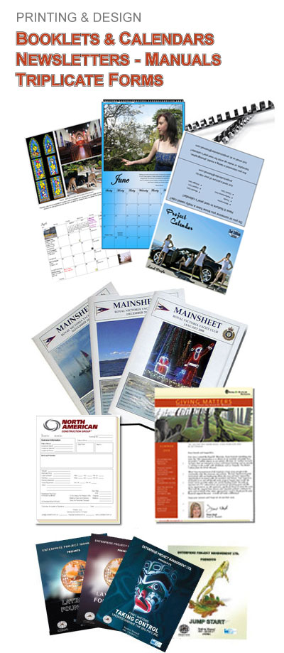 CR Grafx Design will handle all of your Design & Printing needs for your project. We will Print in FULL COLOUR and or B&W for Booklets, Calendars, Newsletters, Pad's, Event Programs, Carbonless Forms, Manuals, Catalogues and more - all at affordable rates.